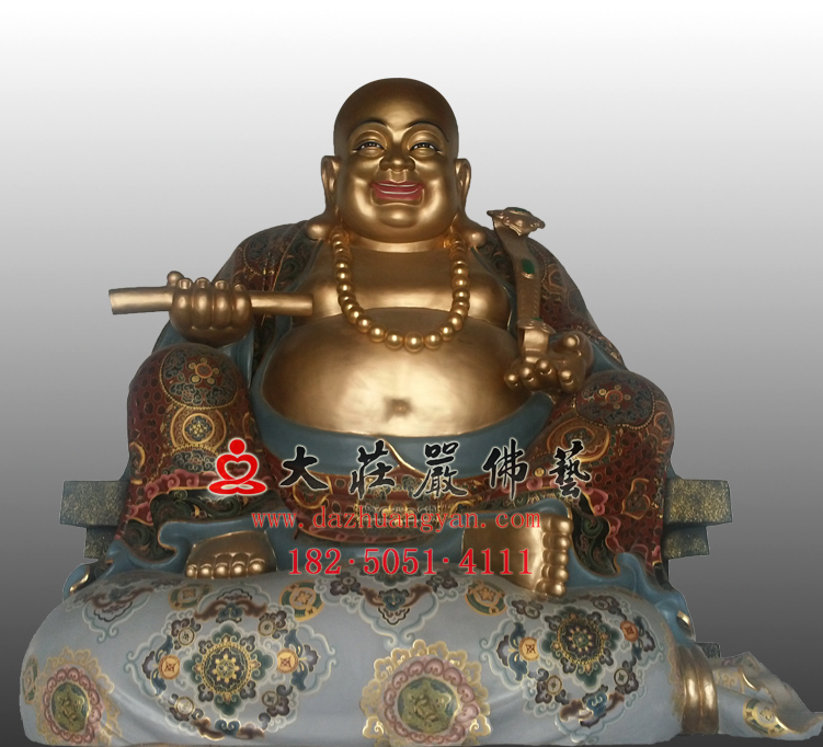 弥勒佛,是佛教未来世界的主持者,弥勒佛现在还是菩萨,还未成佛,现在兜率天内院与诸天演说佛法,经中讲弥勒菩萨最初发心时,即不杀生,不食众生肉;从此以来,都以慈为姓。据说弥勒出生在古印度南天竺一个大婆罗门家庭,后来跟随着释迦牟尼佛出家,被释迦牟尼指定为佛的继承者,称为“未来佛”。此尊弥勒佛是桓台华严寺在莆田市大庄严佛像工艺有限公司订制的,佛像表面是采用贴金彩绘相结合,形象为光头现比丘相,长长的双耳垂肩,脸上满面笑容,身穿袈裟,圆圆的大肚子,袒胸露腹,左脚下垂,右腿弯曲。