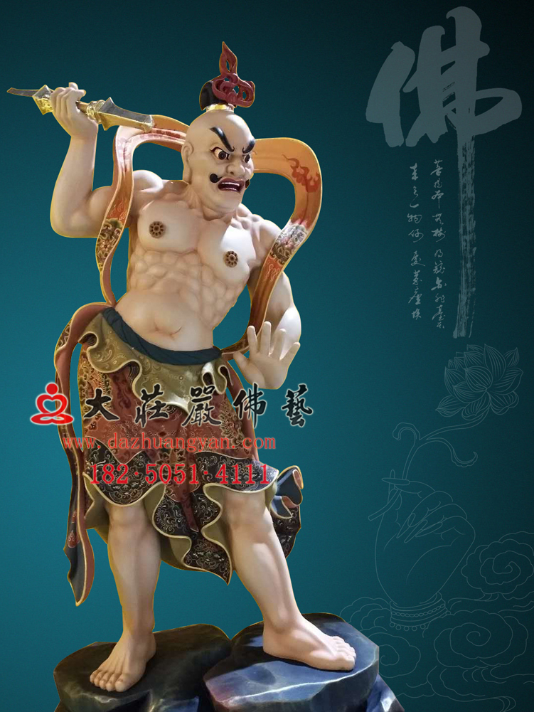 哼哈二将,是佛教守护寺庙的两位金刚力士,此金刚力士哼哈二将铜佛像是莆田市大庄严佛像厂家铸造,哼哈二将的表面是采用贴金彩绘相结合,造像的形象为满脸忿怒之相,睁眼鼓鼻,头戴宝冠,上身裸露,肌肉饱满,手执金刚杆,两脚张开,栩栩如生。哼哈二将是夜叉神的总头目,又名药叉,闭嘴者是哼将,张嘴者是哈将。在《封神演义》中,郑伦、陈奇二将,均是商朝督粮官,各有奇术,一个能以“哼”声降敌,一个能“哈”毒气取胜,均在战争中被杀。周灭商后,姜太公归国封神,敕封二人为镇守山门的专职神仙。后来被佛教吸纳,成为佛教守护神,就是现在的哼哈二将。