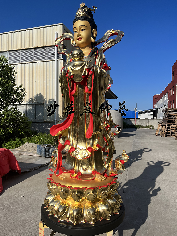 龙女是观音菩萨的右胁侍,据佛经记述龙女原是二十诸天中第十九天婆竭罗龙王的小女儿,是一个在文殊菩萨的法华会上很有名的人物。龙女自幼智慧通达,八岁时已善根成熟,在法华会上听文殊菩萨讲经当众立地成佛。后来,她为辅助观音菩萨普度众生,又由佛身示现为童女身,成为观音菩萨的右近侍。图中龙女赤足站于莲花台之上,手捧着龙珠,神态惟妙惟肖,栩栩如生。
